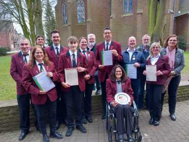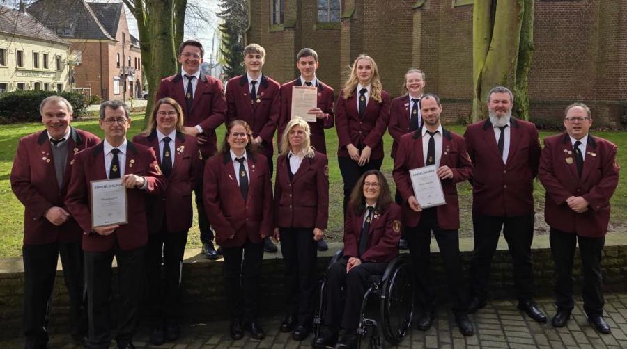 Nach der Messfeier lud der Musikverein ins "Musikforum" zur Mitgliederversammlung ein. Neuwahlen des Vorstandes, Ehrungen und die Jahresberichte für 2024 waren Gegenstand der Jahreshauptversammlung. Nach einem gemeinsamen Frühstück der aktiven, inaktiven und Ehrenmitglieder konnte die Vorsitzende Michaela Waßenberg die Mitglieder des Vereins begrüßen. Leobert Cleef (2. Vorsitzender) übernahm die Aufgabe des Versammlungsleiters und Werner Krings (Präsident) die des Wahlleiters. Bei den Wahlen wurde Lennart Schwartzmanns als Beisitzer bestätigt. Für Heinz-Josef Schrammen, der nach 18 Jahren Vorstandsarbeit sein Amt niederlegte, musste jemand neues gefunden werden, der auch die Interessen und Anliegen der Inaktiven Mitglieder im Vorstand vertritt. Hier konnte als Beisitzerin Nina Krauthausen gewonnen werden. Weiterhin wurde Michaela Waßenberg als 1. Vorsitzende wiedergewählt. Für alle genannten Vorstandsmitglieder beträgt die Wahlperiode drei Jahre. Der 2. Vorsitzende Leobert Cleef gab einen ausführlichen Überblick der unterschiedlichen Tätigkeiten und Gegebenheiten des Vereins im abgelaufenen Geschäftsjahr und Aussichten und Gedanken für das laufende Jahr und die anstehenden Jubiläumsfeierlichkeiten in 2025 kund, während die Versammlung Kassierer Ralf Reißen eine ordnungsgemäße und gute Kassenführung bescheinigte. Mit der Chronik von Jürgen von der Lieck , schön untermalt mit Fotos und humorvoll vorgetragenen Erlebnissen der einzelnen Auftritte, blickten die Musiker nochmals intensiv zurück in das abgelaufene Vereinsjahr. Einen wichtigen und umfangreichen Stellenwert nahmen die Ehrungen verdienter Mitglieder in der Jahreshauptversammlung ein. Aufgrund eines Vorstandsbeschlusses wurden, bei der diesjährigen Jahreshauptversammlung, erstmalig aktive Mitglieder vereinsintern für fünfjährige Mitgliedschaft geehrt. Der Vorstand ist der Überzeugung, dass insbesondere die Jugendlichen hierdurch Auftrieb bekommen und dadurch die Vereinsbindung gestärkt wird. In den Genuss dieser Ehrung kamen Rob Geurts, Jakob Cleef und Renate Berens-Tholen. Für zwanzig Jahre aktives Musizieren wurde Beate Cleef ausgezeichnet. 40 Jahre aktiv im Musikverein Haaren ist Günter Wilms. Nachdem Sie im letzten Jahr für 40 Jahre Vereinstreue ausgezeichnet worden ist, wurde der 2. Schriftführerin des Vereins, Manuela Hamacher eine besondere Ehrung zu teil. Seit 30 Jahren gehört sie ununterbrochen dem Vorstand des Musikvereins Haaren an. Sie wurde mit dem Landesehrenteller des Volksmusikerbunds NRW ausgezeichnet. Einen besonderen Augenblick und eine im Verein bisher einmalige Ehrung, konnte auch Heinz-Josef Schrammen erfahren. Für besonderen Einsatz und Verdienste um den Verein in mehr als 18 Jahren Vorstandsarbeit wurde ihm die Landesehrenmedaille des Volksmusikerbundes NRW verliehen. Alle Ehrungen wurden von der Mitgliederversammlung mit lang anhaltendem Applaus begleitet. Die Ehrungen mit der jeweiligen Laudatio wurden von Michaela Waßenberg und Leobert Cleef vorgenommen. Der Verein bedankte sich bei Daniel Groß für die Arbeit als Notenwart, bei Jakob Cleef für die Führung der Probenstatistik, bei Diemo Lind als Quartiermeister und Instrumentenwart, bei "Liesy" Elisabeth Pistel - die gute Seele des Probenlokals und bei Jürgen von der Lieck für die Führung der Chronik. Auch der Probenbesuch wurde mit einer kleinen Aufmerksamkeit belohnt. "Musiker des Jahres" wurde Max Groß auf Schlagzeug. Das Amt der Kassenprüfer wurde letztmalig von Leo Wallrafen und Willi Storms ausgeführt. Die Nachfolge treten Renate Berens-Tholen und Heinz-Josef Schrammen an. Der Musikverein Haaren konnte im abgelaufenen Jahr 11 Neuaufnahmen verzeichnen und blickt zuversichtlich nach vorne insbesondere zum anstehenden 75. Geburtstag. Im September am Wochenende des 13. und 14. soll mit Freunden, Besuchern aus nah und fern und der Haarener Bevölkerung gefeiert werden. Der Verein stellt die Gemeinschaft, den Zusammenhalt und gegenseitigen Respekt der Musiker und Musikerinnen in den Vordergrund.