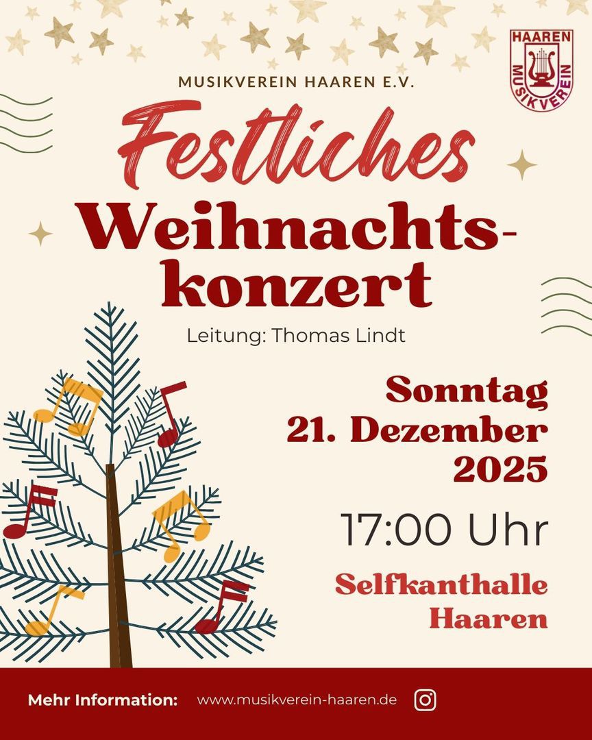Der Musikverein Haaren lädt im Jubiläumsjahr zu seinem 37. Festlichen Weihnachtskonzert am 4. Adventssonntag, 21. Dezember 2025, in die festlich dekorierte Selfkanthalle recht herzlich ein. Ihr, liebes Publikum, habt im letzten Jahr Musik ausgesucht, die wir jetzt spielen dürfen. Aber wir bringen auch ein paar neu einstudierte Konzertstücke, teilweise mit einigen spektakulären Soloparts, zu Gehör.