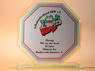 Für die vereinsseitige Ehrung anlässlich der gleichzeitig 40-jährigen Dirigententätigkeit in Haaren schloss sich Präsident Olaf Regnery den Glückwünschen im Namen aller Musikerinnen und Musiker an und überreichte Wil van der Beek eine eigens angefertigte Glasplakette mit Inschrift.